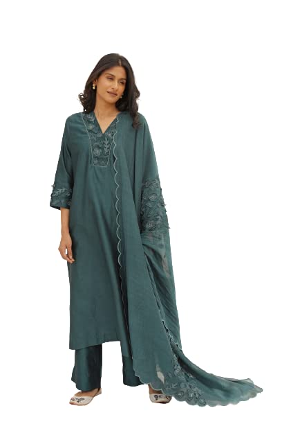 This is Neelu Sethi’s Designer Teal green floral print dress . its a kurta palazzo set with a matching dupatta . Kurta of this dress is of pure chanderi fabric with relaxed fitting and 3/4 th sleeves. It has a v – neck and shantoon lining , the kurti is below knee length. It comes along with cut work embroidery and beadwork. Topped with beautiful dupatta and matching teal green palazzo. The dress is a set of 3 . Its a complete set , best suited for all types of events , family get togethers and festivals. Make your casual meets , parties , festivals and all get togethers with your family more adorable with our ethnic yet so chic and stylish dresses.