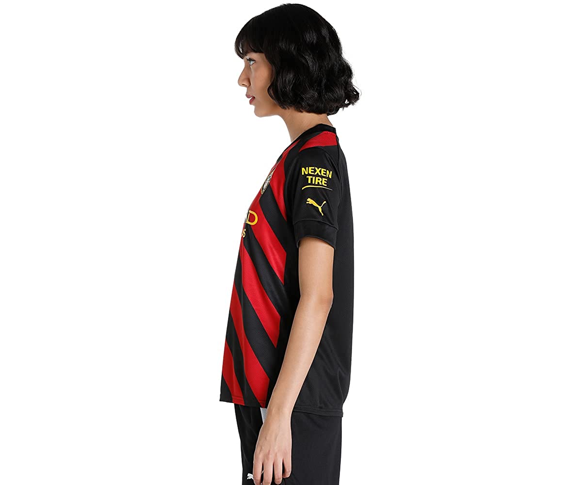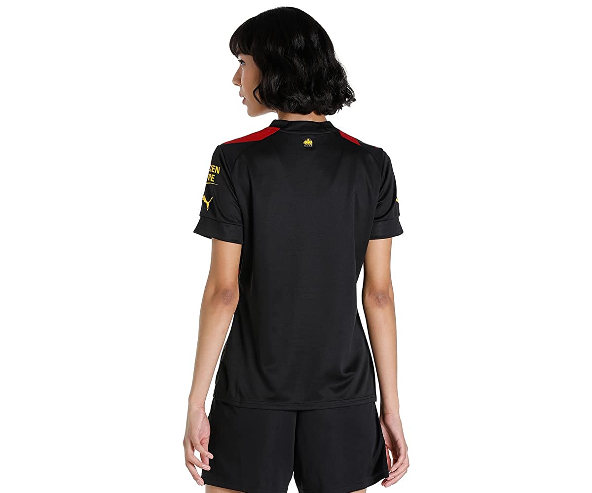 PRODUCT STORY : City put on a show. When the class of 1969 took to the road, they turned heads with their fearless, technically adept football – and their bold and brilliant new away strip. Conceived by the legendary Malcolm Allison, vertical stripes of red and black proved triumphant at the 1969 FA Cup Final, and the 1970 League Cup and European Cup Winners’ Cup finals, earning their place among all-time fan favorites. The 2022/23 Manchester City F.C. Away kit breathes new energy into a classic design. For the first time, red and black stripes flow down the jersey at an angle, inspired by the club crest and representation of the three Manchester rivers. FEATURES & BENEFITS : dryCELL: Performance technology designed to wick moisture from the body and keep you free of sweat during exercise, Midori: Made with the bio-based finishing treatment miDori® bioWick, Recycled Content: Made with 100% recycled material excluding trims & decorations as a step toward a better future DETAILS : Regular fit, Set-in sleeve construction with raglan back seam, Flat knit v-neck, Embroidered PUMA Cat Logo on the chest and sleeves, Official team crest on the chest