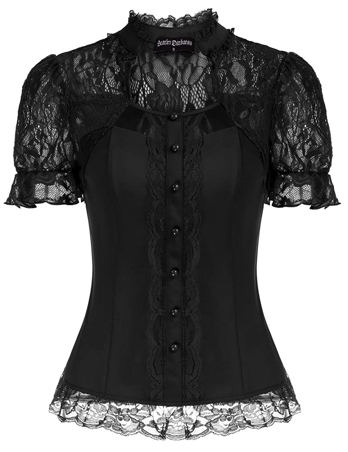 Scarlet Darkness Victorian Tops Short Lace Sleeve Shirts Stand Collar Blouse
