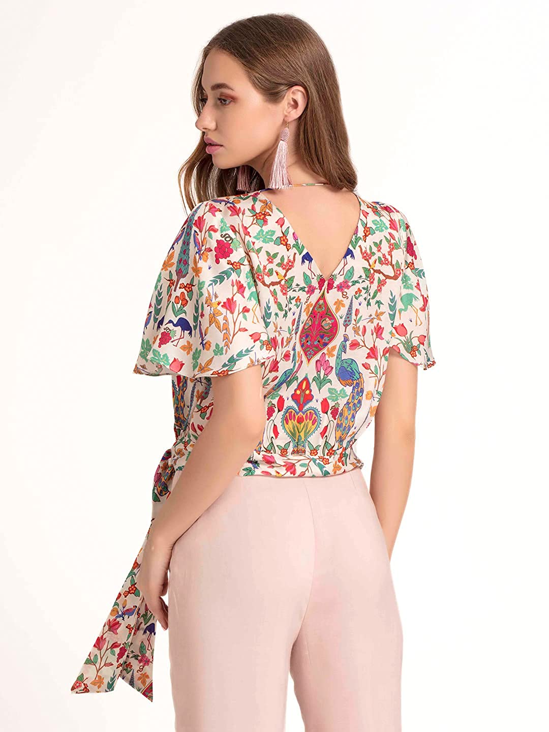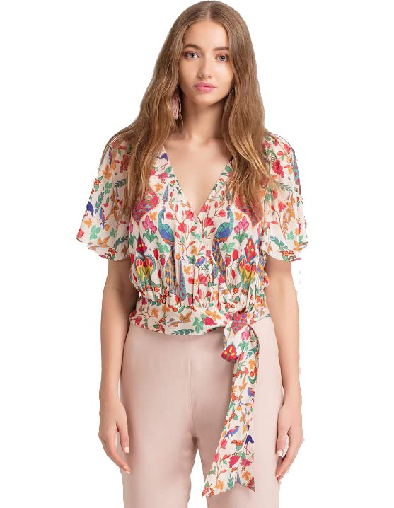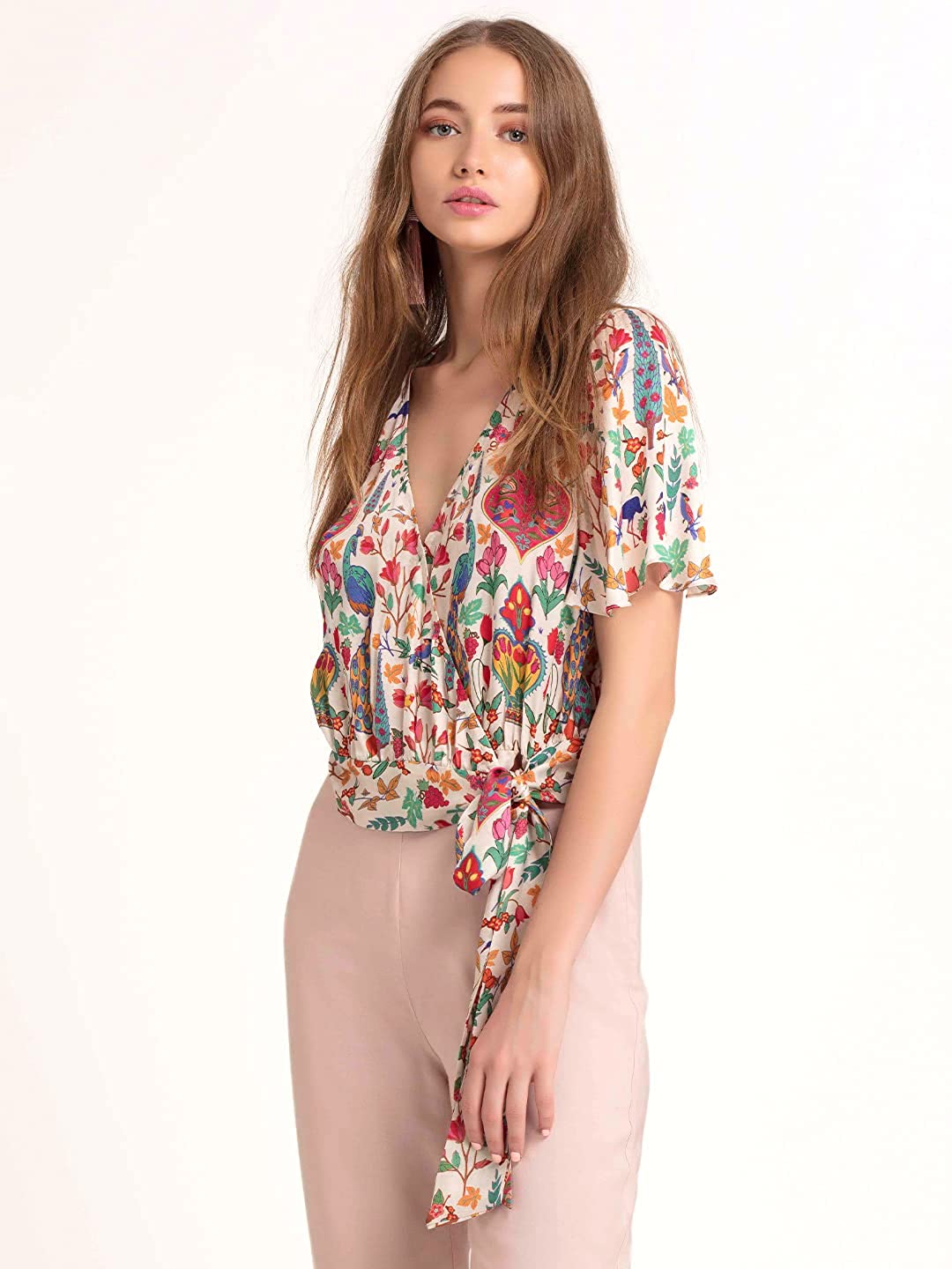 Specifications: Sleeve Length-Short Sleeves: Neck-V-Neck: Type-Wrap: Print or Pattern Type-Floral: Sleeve Styling-Flared Sleeves Surface Styling: Transparency-Opaque: Length-Regular: Main Trend-Floral Print: Occasion-Casual: Weave-Type Woven