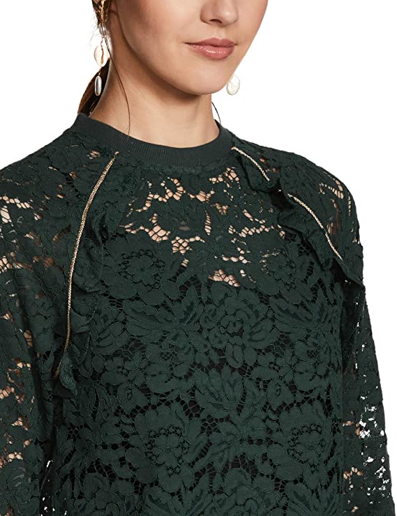 Vero Moda Women Green Lace Long Sleeve Band Collar Top